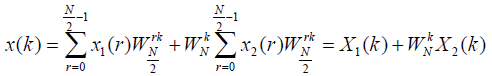 根据傅里叶变换的对称性和周期性,我们可以将DFT运算中有些项进行合并。先设序列长度为N=2^L,L为整数。将N=2^L的序列x(n)(n=0,1,……,N-1),按N的奇偶分成两组,也就是说我们将一个N点的DFT分解成两个N/2点的DFT,他们又从新组合成一个如下式所表达的N点DFT:
